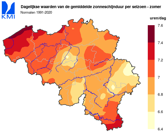 Wanneer we naar het jaarlijkse gemiddelde kijken, varieert de dagelijkse gemiddelde zonneschijnduur tussen 4.2 uur zon op de Hoge Venen en bijna 5.2 uur aan de Kust. Deze ruimtelijke verdelingen zijn sterk verbonden met de gemiddelde bewolkingsgraad. De omvangrijke variaties gedurende het jaar over het land (van gemiddeld 1.6 uur in december tot 7.1 uur in de zomer) zijn het gevolg van de evolutie van de periode tussen zonsopkomst en –ondergang.