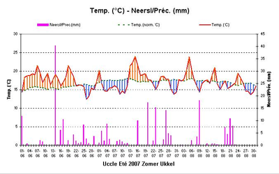 De zomer (van juni tot augustus, zie figuur 3) werd gekenmerkt door een abnormaal hoge neerslaghoeveelheid: men registreerde 252,8 mm te Ukkel voor een seizoensnormale van 210,4 mm. Naast dit gegeven en in tegenstelling tot de uitzonderlijke zomer 2006 door de warmte van juli en de neerslag van augustus was de zomer 2007 eerder banaal, conform aan een typische Belgische zomer.