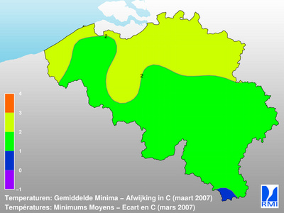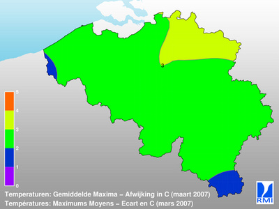 De maritieme en continentale luchtstromingen lagen aan de oorsprong van een relatief uitgesproken overschrijding van de temperaturen. De afwijkingen van de maandgemiddelden van de dagelijkse maximumtemperaturen t.o.v. de normale waarden lagen tussen +1,5 °C en +3,0 °C. De afwijkingen van de maandgemiddelden van de dagelijkse minimumtemperaturen t.o.v. de normale waarden lagen tussen +0,5 °C en +2,5 °C. De absolute maxima waren begrepen tussen 15 °C en 20 °C en werden het meest waargenomen tussen de 26ste en de 28ste. De absolute minima varieerden tussen -4 °C en 1 °C en werden vooral de 20ste geobserveerd. In Ukkel bedroeg de gemiddelde temperatuur 8,0 °C (norm.: 5,5 °C). De gemiddelde uitersten waren respectievelijk 12,1 °C en 3,9 °C (norm.: 9,0 °C en 2,2 °C). De absolute uitersten bedroegen respectievelijk 18,1 °C (de 26ste) en -1,1 °C (de 20ste) (norm.: 17,2 °C en ?4,2 °C). Er was 1 vorstdag (min < 0 °C) (norm.: 8,4 d.), maar geen enkele winterdag (max < 0 °C) (norm.: 0,7 d.).