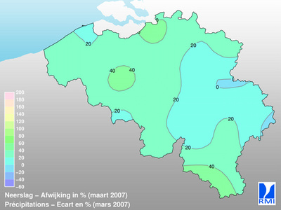 De streekgemiddelden van neerslag waren nagenoeg allen hoger dan de normalen. Ze varieerden van 95% van de normale waarde in de streek van Herve tot 141% in de Borinage. De afwijkingen waren overal normaal. De hoogste dagtotalen varieerden van minder dan 5 mm tot meer dan 40 mm en deden zich overwegend voor de 6de. Op die dag werd een waarde van meer dan 40 mm waargenomen in Petite-Chapelle (Couvin) met 42,9 mm. In Ukkel was de neerslagfrequentie normaal: er viel in totaal 61,9 mm neerslag in 20 dagen (norm.: 53,6 mm in 18 d.).