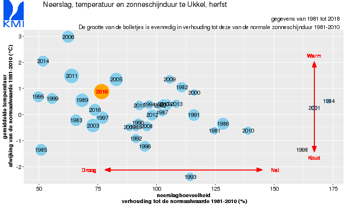 Hieronder vindt u het klimatologisch overzicht van de herfst van 2018 (september 2018 tot november 2018) voor 4 parameters. Tevens wordt deze herfst vergeleken met de 5 meest extreme herfsten voor elke parameter.