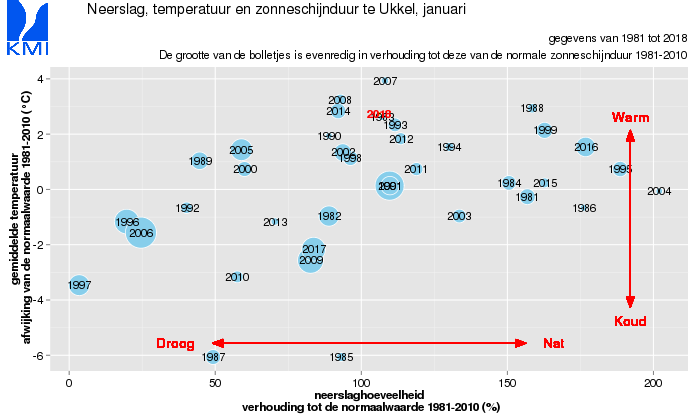 De eerste dag van het nieuwe jaar kreeg ons land stevige windstoten te verduren door een krachtig lagedrukgebied gelegen tussen Schotland en Noorwegen die zachte maritieme luchtstromingen aanvoerde. Ons land bleef ook van de 2e tot de 5e onder een krachtig windveld liggen door een nieuw lagedrukgebied dat zich vanaf de Atlantische Oceaan verplaatste naar West-Europa. De aangevoerde lucht bleef zacht en vochtig. Vanaf de 6e werd het droger en kouder door de aanvoer van continentale lucht door de aanwezigheid van een hogedrukgebied boven Schotland. Vanaf de 8e verplaatste dit zich naar het noordoosten van Europa. Aanvankelijk bleef de aangevoerde lucht fris maar vanaf de 10e kregen we terug zachtere maar vochtige maritieme lucht boven ons land door de aanwezigheid van een lagedrukgebied ten zuiden van IJsland. Van de 11e tot de 14e werd koele, maar droge continentale lucht naar ons land gedreven door de invloed van een krachtig hogedrukgebied met centrum boven Zuid-Finland en de Baltische Staten. Vanaf de 15e ondervonden wij de doortocht van verschillende lagedrukgebieden die vanaf het zuiden van Groenland richting West-Europa doortrokken. Hierdoor kwamen wij verschillende dagen onder een krachtig windveld te liggen van relatief zachte maar vochtige, maritieme luchtstromingen met als hoogtepunt de doortocht van een krachtige, snel ontwikkelende storm op de 18e. De 19e zwakte de wind af en werd het droger. De 20e schoof er opnieuw een depressie over ons land en de 21e werd er koele en vochtige maritieme zeelucht naar ons land aangevoerd doordat we tussen een complex lagedrukgebied ten zuiden van IJsland en een anticycloon met centrum boven Zuid-Portugal lagen. Vanaf de 22e verplaatste de kern van dit lagedrukgebied zich naar Schotland waardoor de luchtstroming meer uit zuidwestelijke richting kwamen en zachtere, maar aanhoudend vochtige lucht over ons land bleef stromen tot de 25e. Vanaf de 26e breidde de anticycloon zich verder uit over Zuid-Europa maar aan de noordkant hiervan bleven vochtige, doch relatief zachte luchtstromingen waarin talrijke fronten voorkwamen ons weerbeeld bepalen tot het einde van de maand. Te Ukkel bedroeg de gemiddelde luchtdruk op zeeniveau 1012,1 hPa (norm: 1017,5 hPa).
