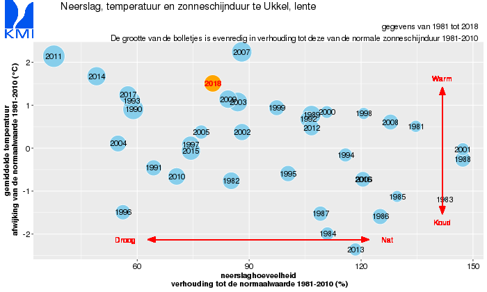 Hieronder vindt u het klimatologisch overzicht van de lente van 2018 (maart 2018 tot mei 2018) voor 4 parameters. Tevens wordt deze lente vergeleken met de 5 meest extreme lentes voor elke parameter.