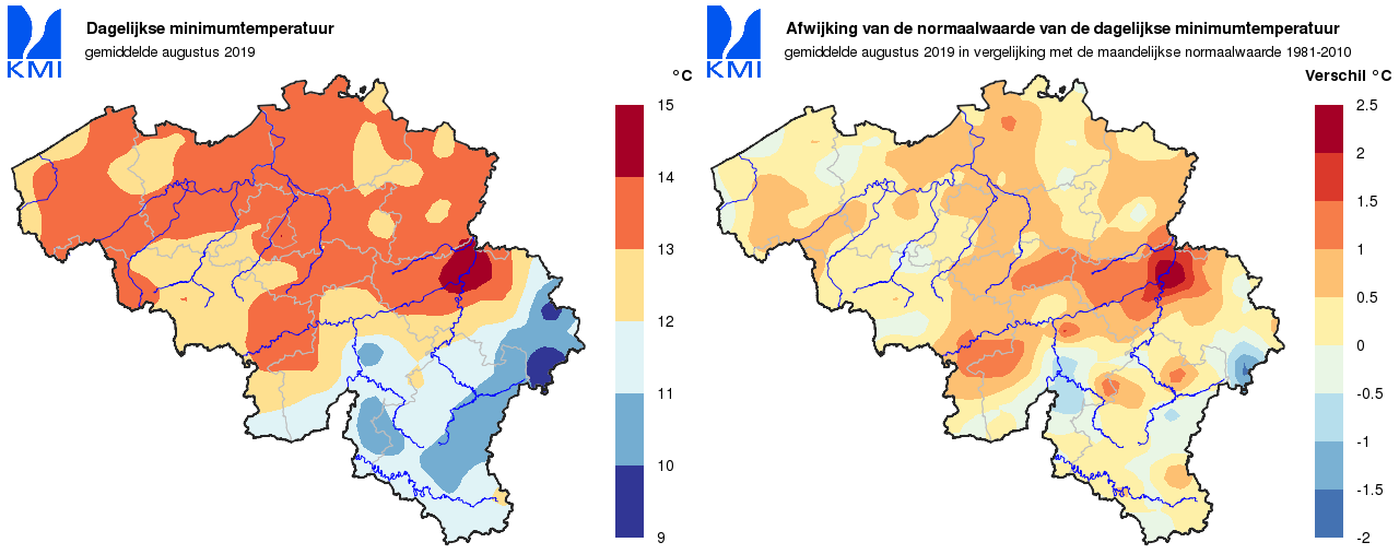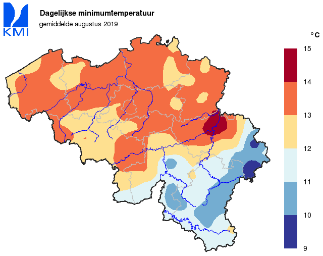 De eerste 10 dagen van augustus lagen de temperaturen meestal boven de normale waarden. Daartegenover lagen de temperaturen van de 11de tot de 21ste (soms ruim) onder de respectievelijke normalen. Met slechts 16,5°C was de gemiddelde temperatuur van de tweede decade (11-20 augustus) uiteindelijk de vijfde koudste, toch nog ver achter het record van 2014 (14,7°C). Vanaf de 22ste stegen de temperaturen opnieuw tot boven de normalen. Uiteindelijk bereikten we zelfs een nieuw record voor de gemiddelde temperatuur van derde decade (21-31 augustus): 21,0°C (normaal: 16,9°C, vorig record 20,6°C in 2016).