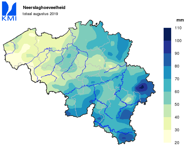 In ons land vielen de grootste neerslaghoeveelheden tijdens de onweders die over ons land trokken. In Gouvy werd de grootste hoeveelheid geregistreerd. Op de 9de viel er daar 37,2 mm neerslag.