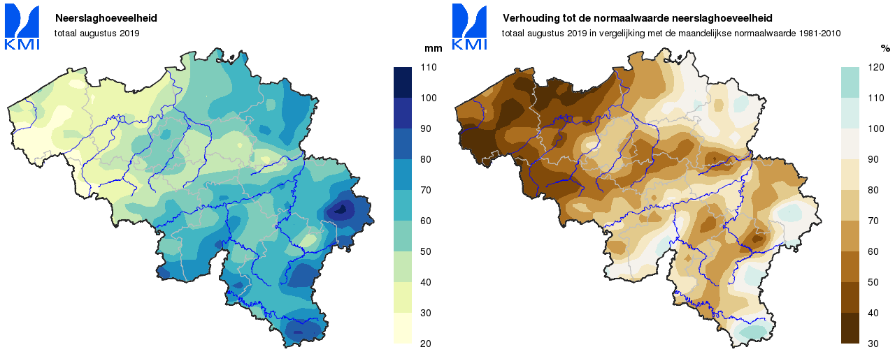 De gemiddelde regionale neerslaghoeveelheden in ons land lagen overal onder de normalen. Ze varieerden van ongeveer 45% van de normale aan de kust tot ongeveer 95% van de normale in Belgisch Lotharingen.