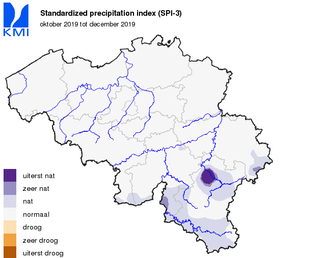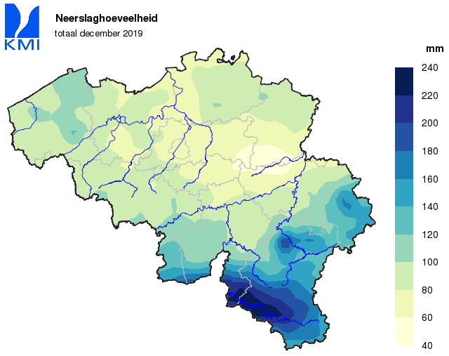 De gemiddelde regionale neerslaghoeveelheden in ons land lagen bijna overal boven de normalen. Ze varieerden van ongeveer 85% van de normale in Haspengouw tot ongeveer 130% van de normale in de Ardennen.