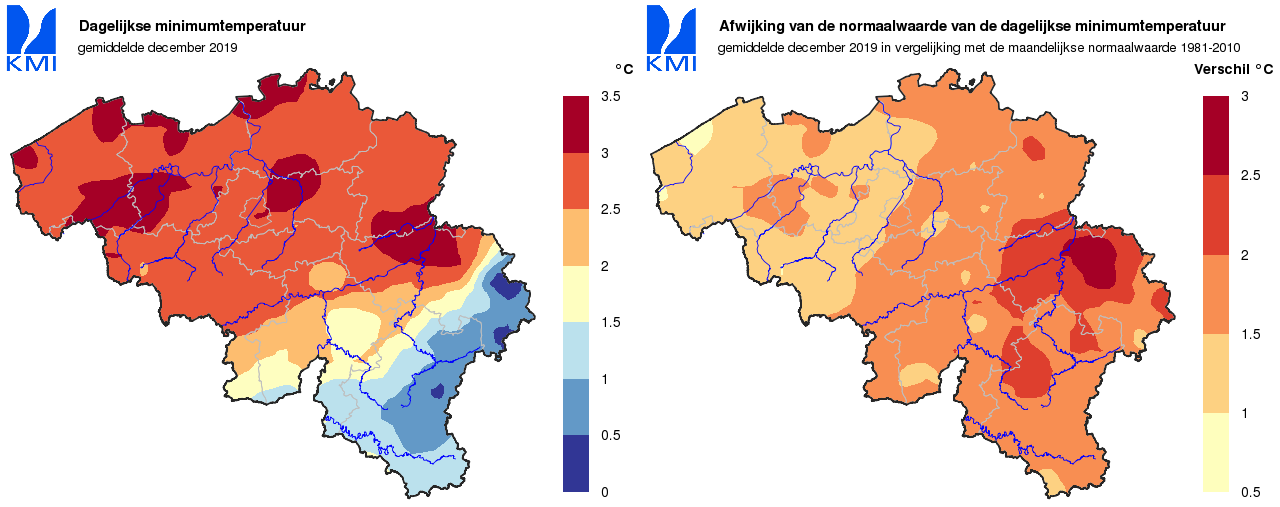 In de rest ons land werd de hoogste temperatuur op de 17de gemeten. In Luik-Monsin (Luik) steeg de temperatuur toen tot 16,6°C. De laagste temperatuur werd op de 20ste geregistreerd. In Elsenborn (Bütgenbach) daalde de temperatuur tot –6,9°C.