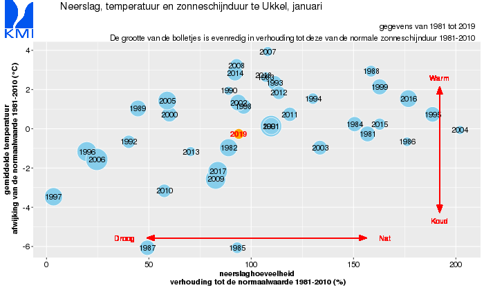 De tabel hieronder geeft de maandelijkse waarden van een reeks parameters weer gemeten te Ukkel (kolom "Maand"), alsook de normale maandelijkse waarden ("Norm".) en de maandelijkse recordwaarden van 1981 tot 2018("Record +" en "Record -") met de respectievelijke jaartallen. De kolom "kar" duidt de statistische karakteristiek aan van de waargenomen maandwaarde ("Maand").