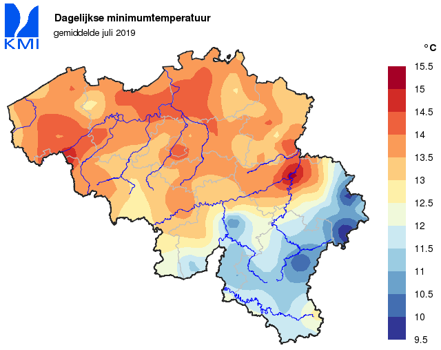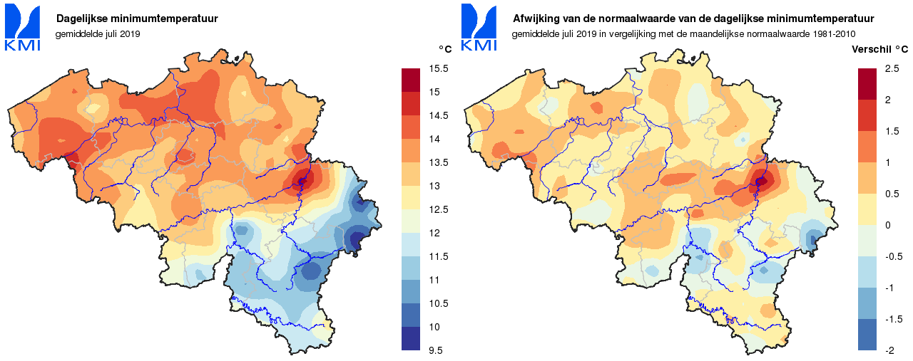 Deze maxima staan in schril contrast met de laagste temperatuur die er deze maand werd geregistreerd: in Elsenborn (Bütgenbach) daalde de temperatuur op de 8ste tot 1,6°C. Tijdens de hittegolf kenden we ook warme nachten: de hoogste minimumtemperatuur werd op de 26ste in Nethen (Graven) geregistreerd waar het niet kouder werd dan 24,8°C.