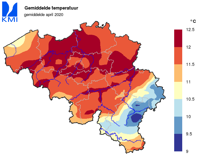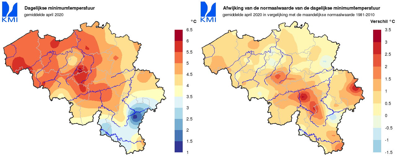 De laagste temperatuur werd al op de 1ste geregistreerd. In Elsenborn (Bütgenbach) daalde de temperatuur nog tot -7,6°C. Iets kouder dan op het einde van maart: de 30ste daalde de temperatuur hier tot -6,9°C.