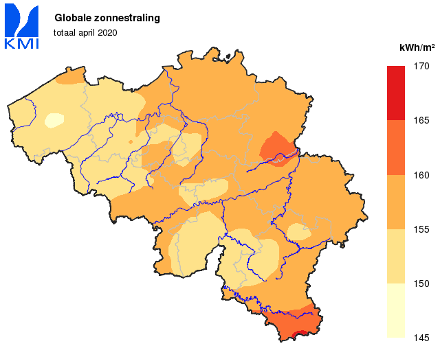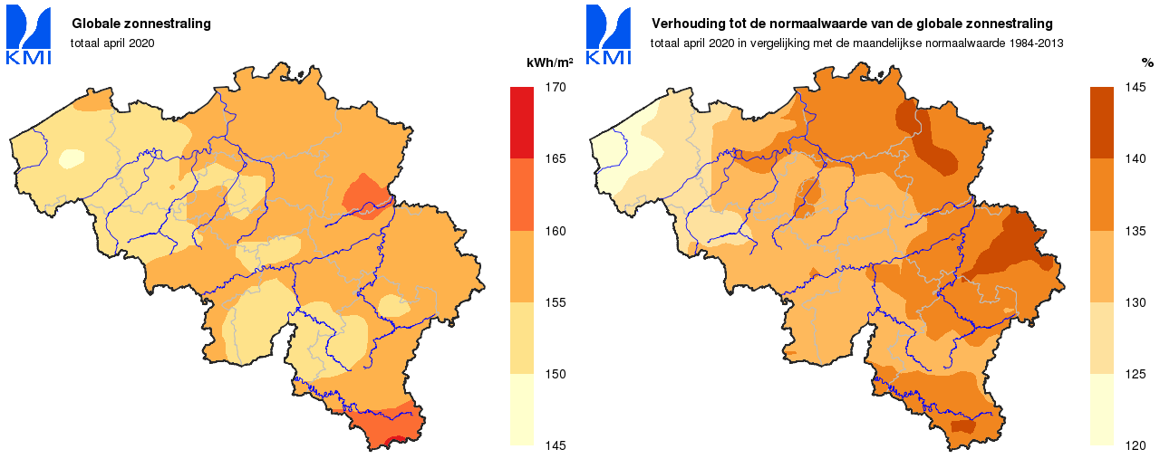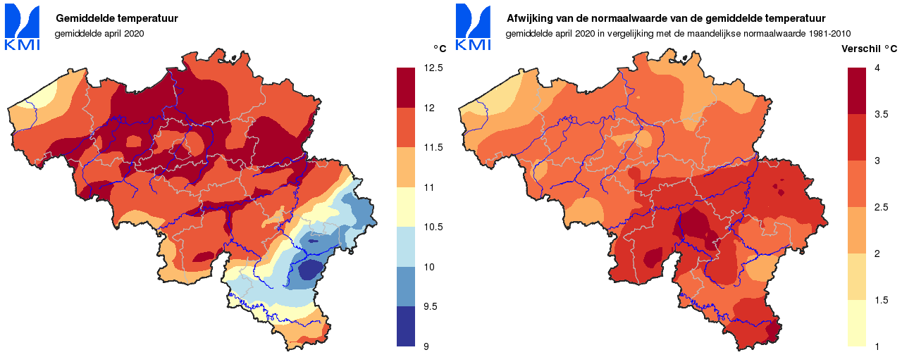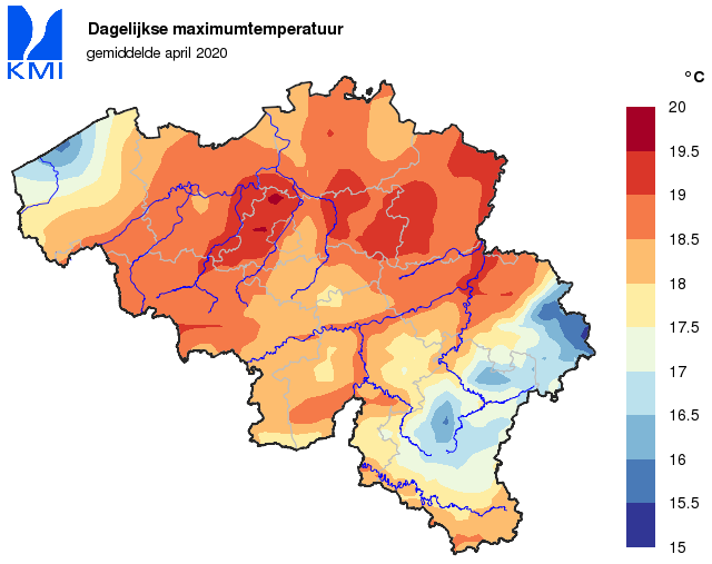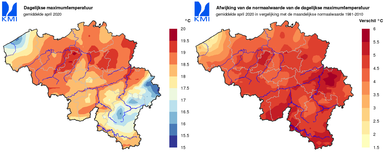 Het is dan ook niet verwonderlijk dat de gemiddelde temperaturen van april uiteindelijk boven hun respectievelijke normalen lagen. Vooral de waarde van de gemiddelde maximumtemperatuur (18,3°C) sprong eruit: ze eindigde op een derde plaats in het rijtje van warmste aprilmaanden (metingen vanaf 1833) achter het record van 2007 (20,5°C) en achter 2011 (19,6°C).