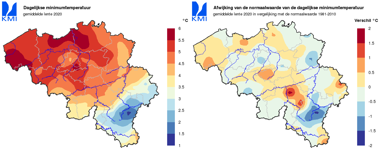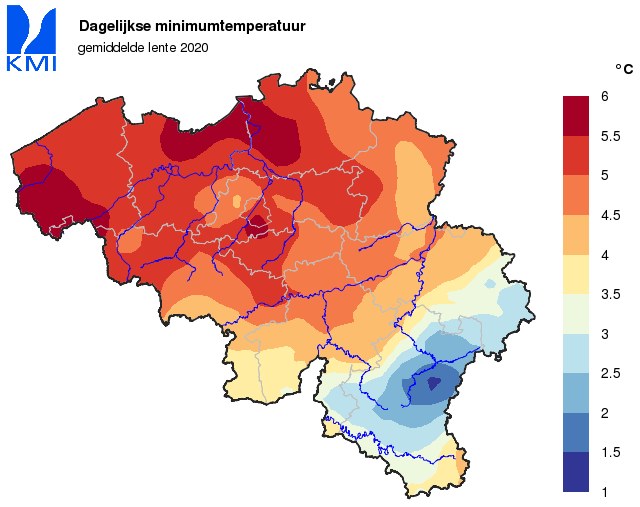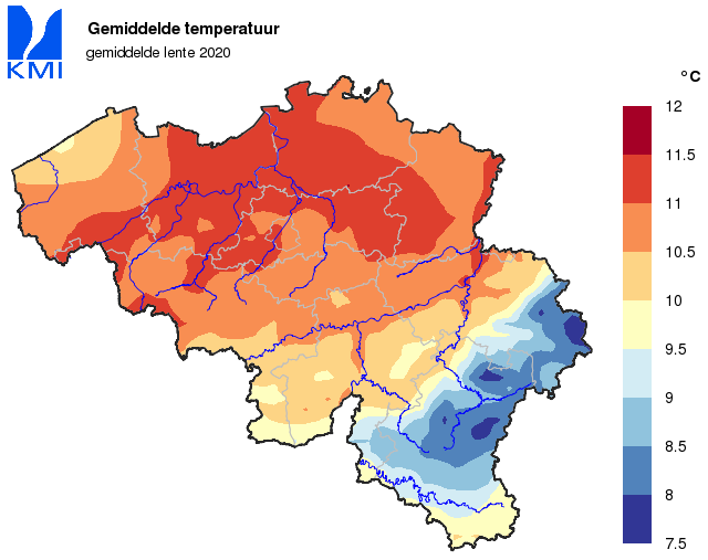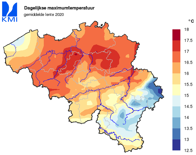Onder meer door de hoge maxima van april, registreerden we afgelopen lente een gemiddelde maximumtemperatuur van 16,2°C (normaal: 14,2°C), goed voor een derde plaats sinds het begin van de metingen in 1901. Enkel in 2011 (17,3°C) en 2007 (17,2°C) werd het nog warmer.