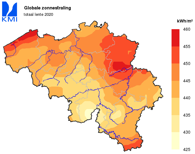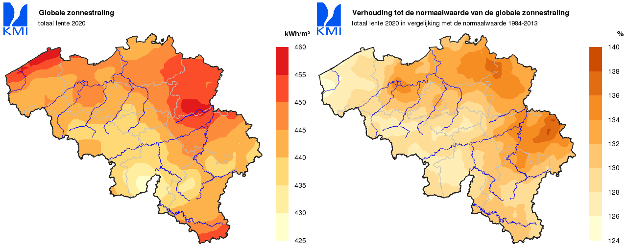 Alle drie de lentemaanden waren veel zonniger dan gemiddeld, al sprong vooral april eruit (tweede zonnigste aprilmaand sinds het begin van de waarnemingen in 1887). Hierdoor was de lente in zijn totaal veel zonniger dan normaal. De zon scheen uiteindelijk maar liefst 740u 46min in Ukkel (normaal: 463u 58min), meteen goed voor een nieuw absoluut record (metingen vanaf 1887). Het vorige record dateerde nog maar van 2011 (707u 16min).