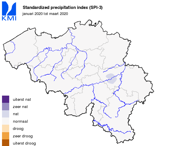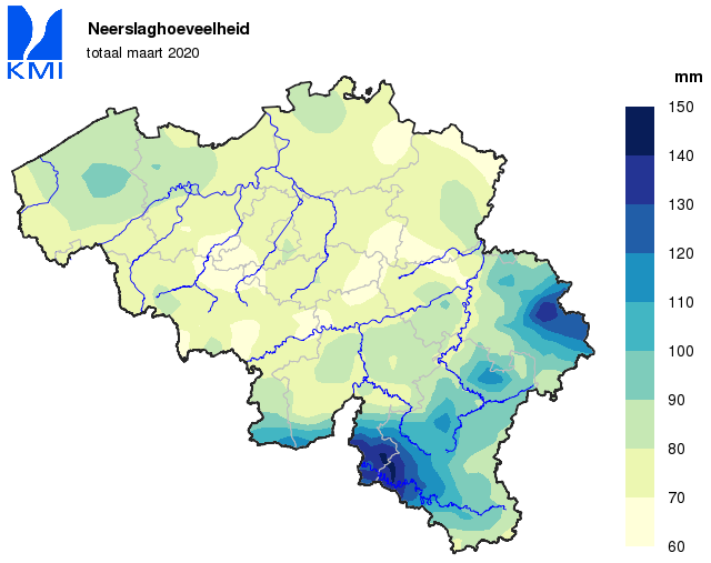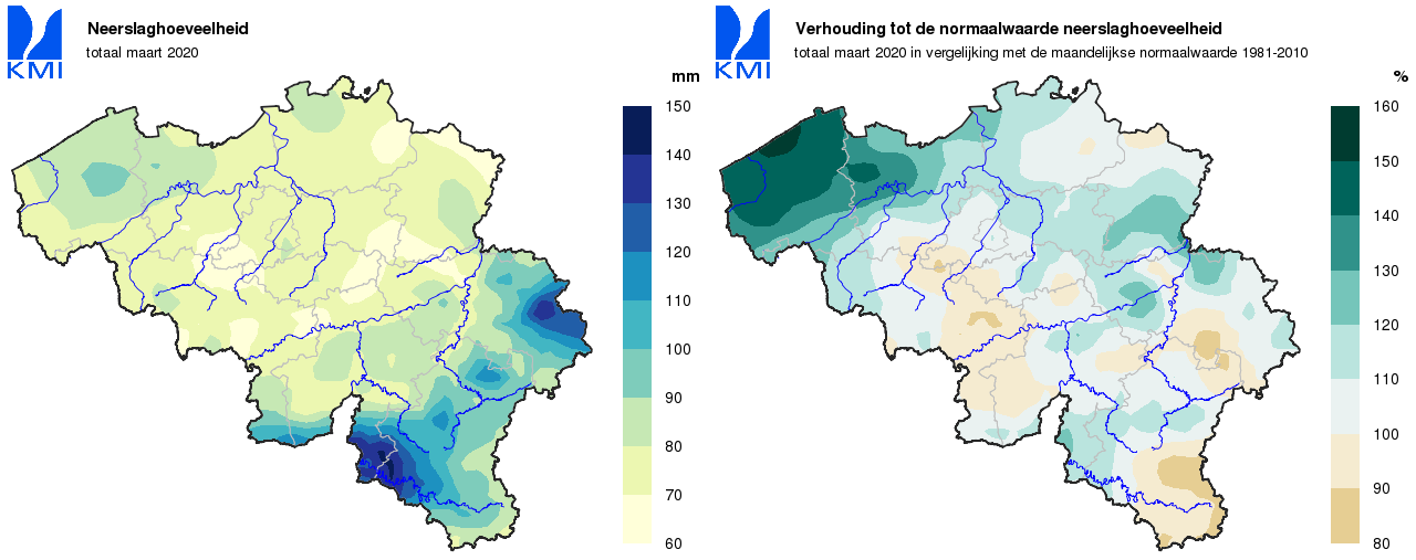 De gemiddelde regionale neerslaghoeveelheden in ons land lagen bijna overal boven de normalen. Ze varieerden van ongeveer 90% van de normale in Belgisch Lotharingen tot ongeveer 150% van de normale aan de kust.