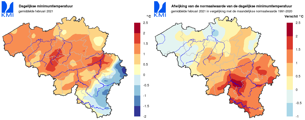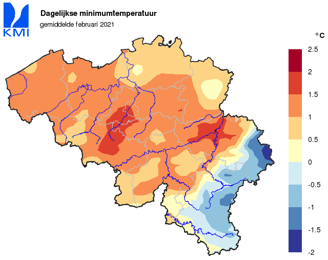 - De laagste minimumtemperatuur werd op de 10de geregistreerd. Dit was de vijfde laagste voor de huidige referentieperiode en bedroeg -8,6°C.