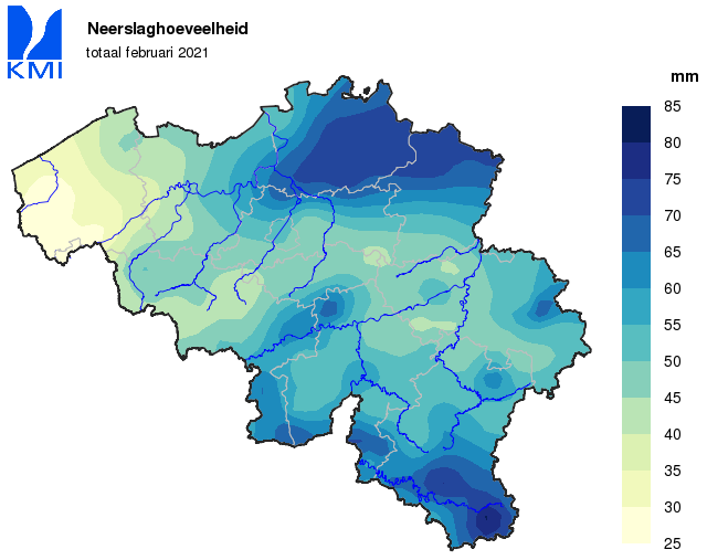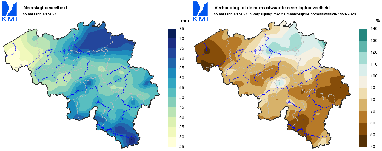 De maandelijkse gemiddelde regionale neerslaghoeveelheden in ons land lagen bijna overal onder de normalen. Ze varieerden van ongeveer 55% van de normale in de streek van Gileppe en Warche tot ongeveer 105% van de normale in de Kempen.