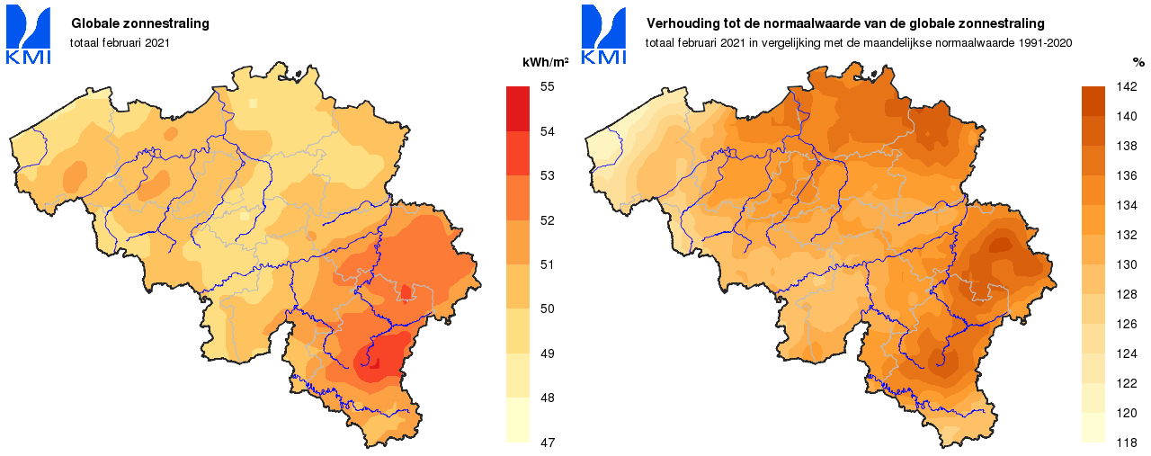 De afgelopen maand begon somber. Vanaf de 9de liet de zon zich echter alsmaar meer zien en uiteindelijk werd februari 2021 een zeer zonnige maand. In Ukkel scheen de zon in totaal 121u 25min (normaal: 72u 54min).