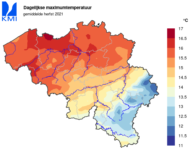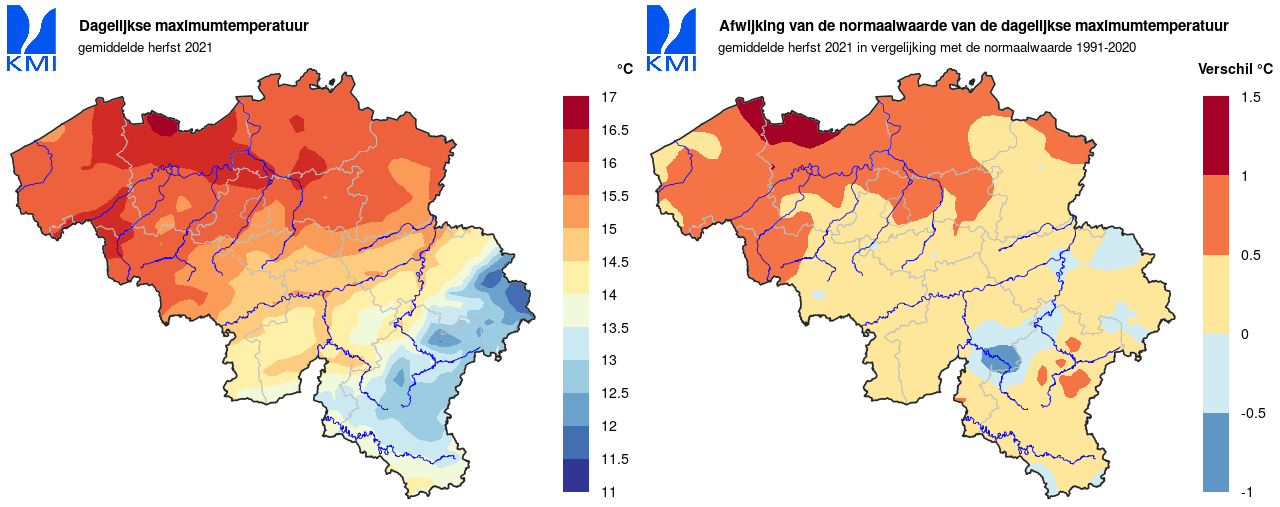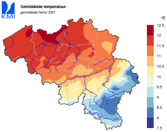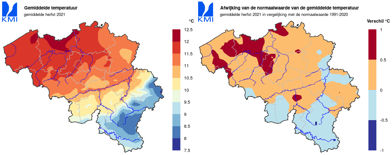 In zijn totaal was de herfst net iets warmer met een gemiddelde temperatuur van 11,5°C (normaal: 11,2°C).