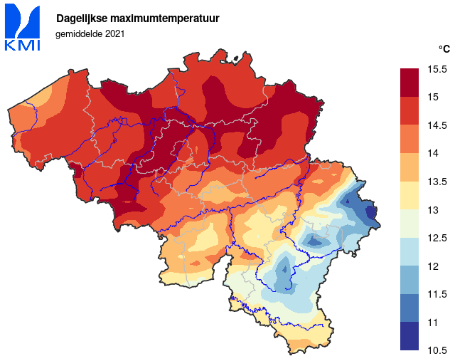 In 2021 bedroeg de gemiddelde temperatuur in Ukkel 10,7°C (normaal: 11,0°C).