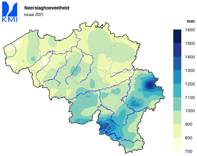 In ons land varieerden de jaarlijkse totalen tussen 773,5 mm in Sint-Maria-Latem (Zwalm) en 1574,1 mm in Mont-Rigi (Weismes).