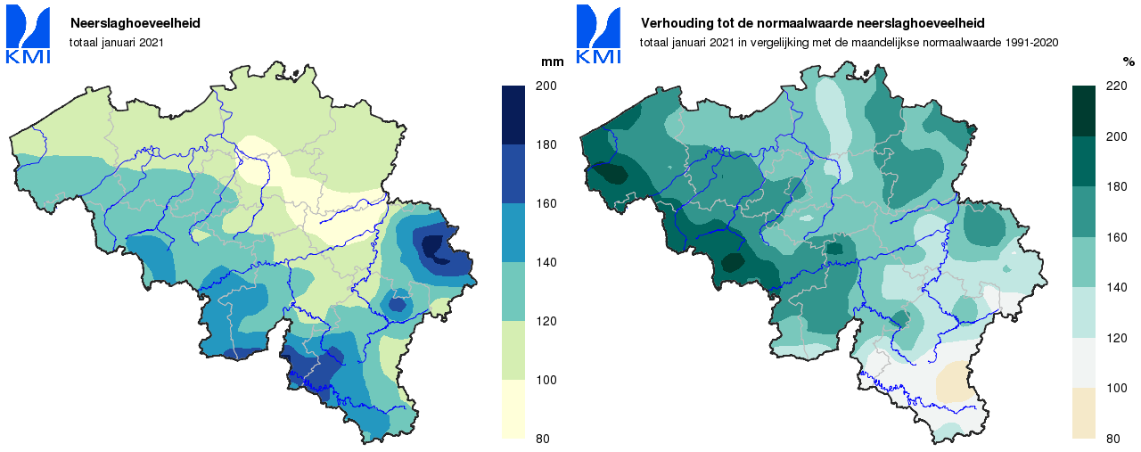 De maandelijkse gemiddelde regionale neerslaghoeveelheden in ons land lagen overal boven de normalen. Ze varieerden van ongeveer 110% van de normale in Belgisch Lotharingen tot ongeveer 190% van de normale in het gebied tussen Samber en Maas kust.