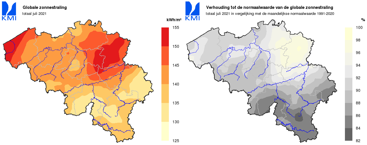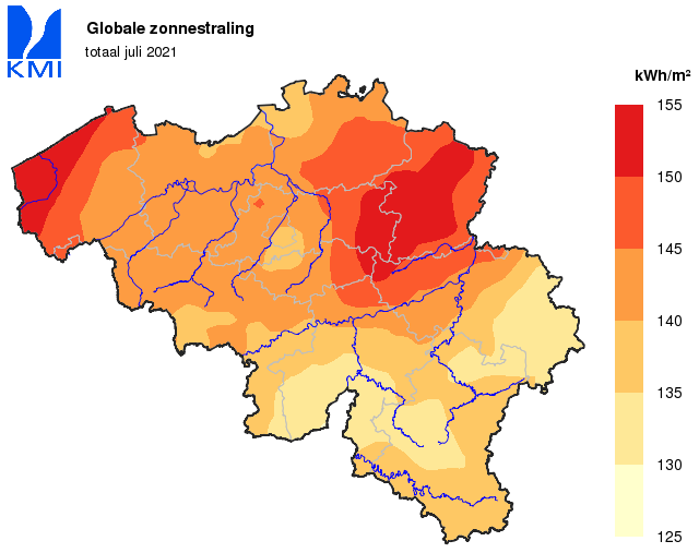 In Ukkel scheen de zon in totaal slechts 171u 03min (normaal: 203u 14min). April (198u 38min) en juni (201u 34min) waren zonniger dan deze tweede zomermaand.