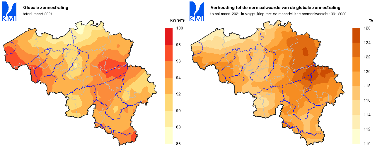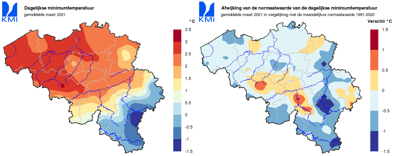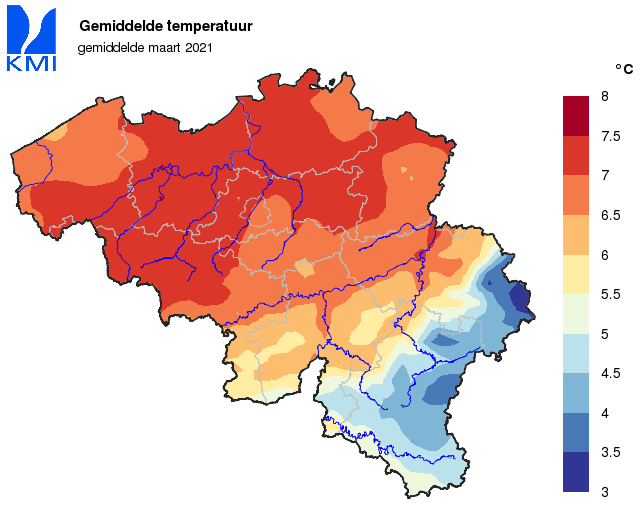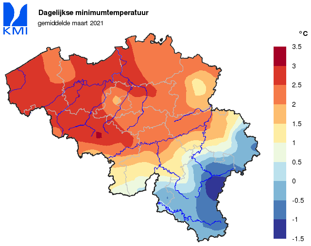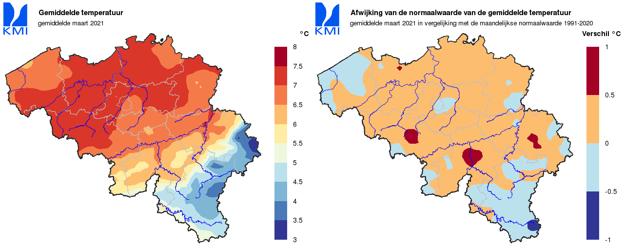 In ons land werd de hoogste temperatuur op de 31ste gemeten. In Koersel (Beringen) steeg de temperatuur tot 26,8°C. Dit was de hoogste temperatuur die we in een maand maart in het klimatologisch meetnet van ons land hebben geregistreerd sinds 1954 (vorig record: 25,8°C op 29 maart 1968 in Angleur (Luik)).
