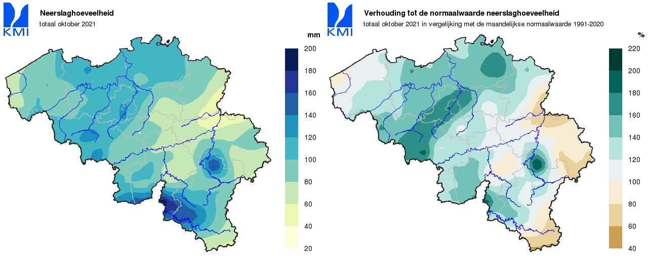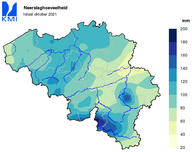 In totaal viel er in Ukkel de afgelopen maand 121,1 mm neerslag (normaal: 67,8 mm) op 19 dagen (normaal: 16,1 dagen). Daarmee was deze oktobermaand de tweede natste van de huidige referentieperiode, achter het record van 1998 (128,7 mm). De meeste neerslag viel in het begin en op het einde van de maand.