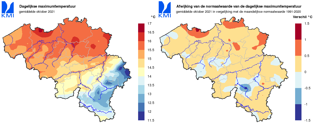 De eerste dagen van de maand schommelden de temperaturen in Ukkel rond de respectievelijke normalen. Op enkele warmere dagen na (18-20 oktober), bleven de temperaturen daarna onder deze normalen. Vanaf de 26ste volgden dan nog een aantal dagen waarbij de temperaturen tot boven de respectievelijke normalen stegen.