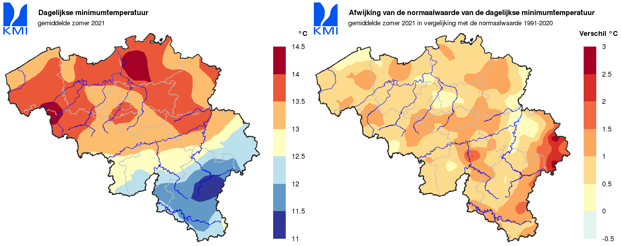 De gemiddelde minimumtemperatuur vormde hierop een uitzondering: in juni bereikten we een nieuw absoluut record voor deze temperatuur, in juli was dit de enige gemiddelde maandtemperatuur die boven zijn normale lag en in augustus lag deze waarde het dichtst bij zijn normale. De uiteindelijke gemiddelde minimumtemperatuur van Ukkel bedroeg 13,9°C (normaal: 13,4°C), goed voor een vierde plaats, samen met 2006 en 2019.