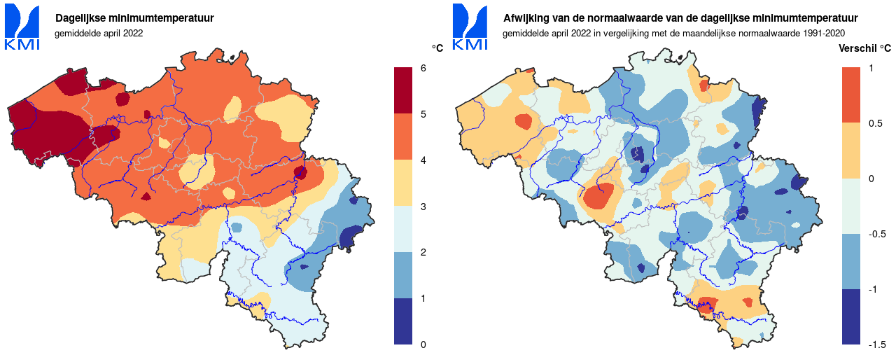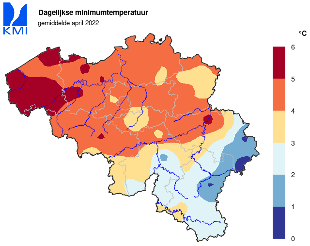 Door de aanvoer van polaire lucht tijdens de eerste decade van april, is er toch één parameter die eruit springt: de absolute minimumtemperatuur (de laagste minimumtemperatuur die deze maand werd geregistreerd). Op 3 april bedroeg deze slechts -2,9°C in Ukkel (normaal: 0,2°C). Daarmee was dit de laagste waarde van de huidige referentieperiode. Het vorige record dateerde al van 1991 (-2,4°C). Wanneer we naar de volledige periode kijken (metingen vanaf 1892), zien we dat dit de zesde laagste waarde was. Het record dateert van april 1986 toen de minimumtemperatuur hier tot -4,7°C daalde.