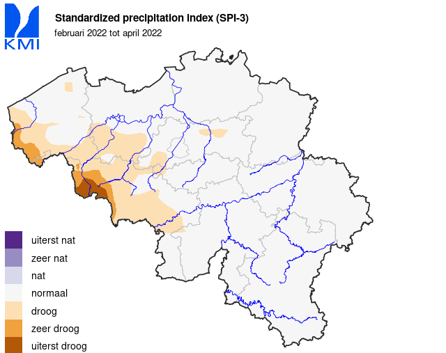 In ons land viel de minste neerslag in het Doornikse (ongeveer 40% van de normale hoeveelheid). Dit is de enige streek in ons land waar het momenteel al uiterst droog is. In het grootste deel van de rest van ons land is de situatie momenteel nog ‘normaal’, maar wel niet ver van een droge situatie. Uitleg en figuren kan je hier terugvinden: https://www.meteo.be/nl/weer/verwachtingen/droogte