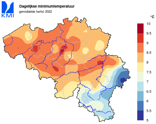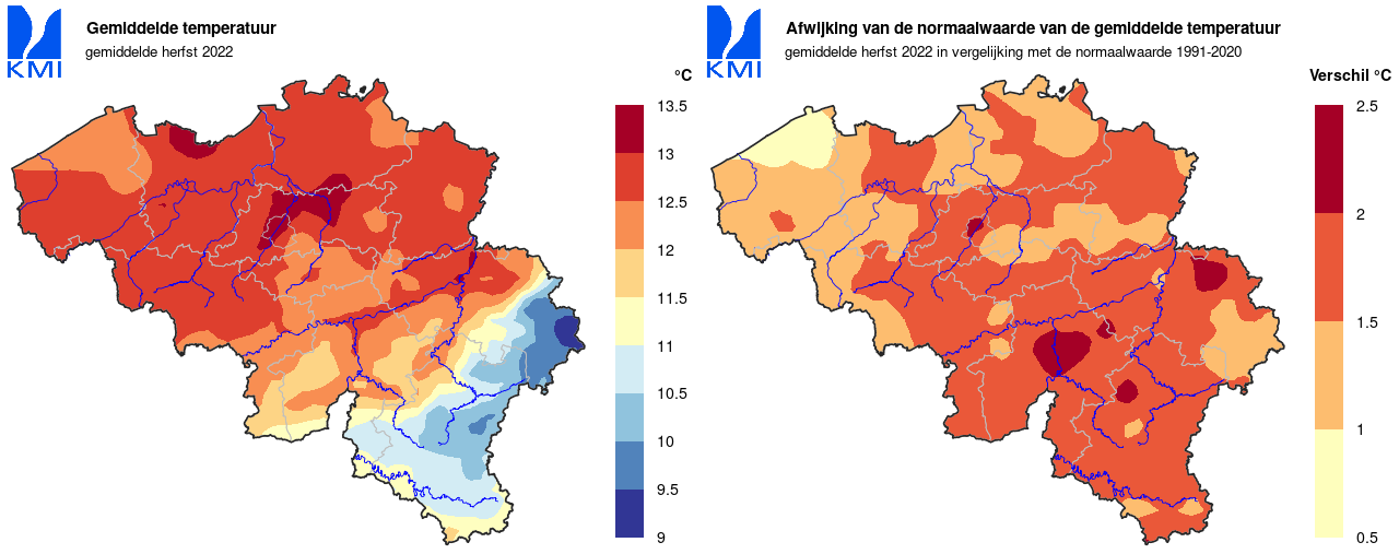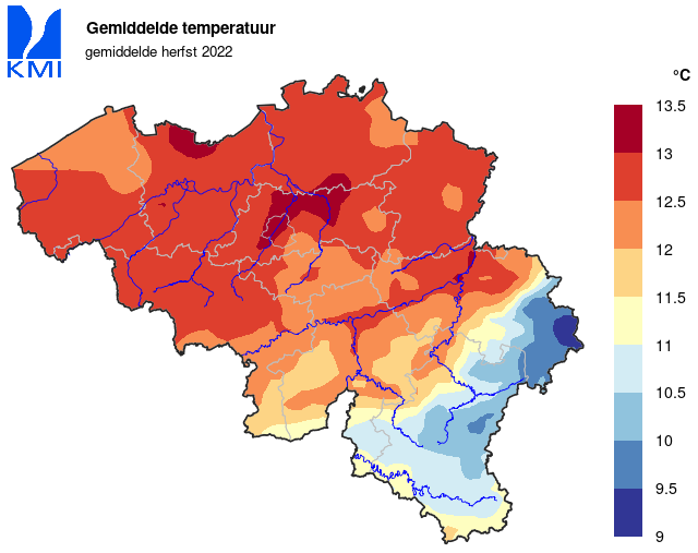 Hierdoor was de herfst van 2022 gemiddeld genomen ook heel wat warmer dan normaal. De gemiddelde temperatuur bedroeg in Ukkel 12,8°C (normaal: 11,2°C). Daarmee was dit de derde warmste herfst sinds het begin van de waarnemingen (metingen vanaf 1833). Het absolute record blijft staan op 13,9°C (2006) en 2014 staat op de tweede plaats (13,0°C).