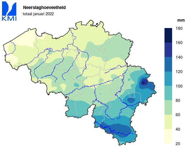 In totaal viel er in Ukkel de afgelopen maand 67,2 mm neerslag (normaal: 75,5 mm). Het grootste deel hiervan viel in het begin van de maand: tijdens de eerste decade (1-10 januari) viel er in totaal 55,8 mm neerslag. Daarmee was dit de derde natste eerste decade van de huidige referentieperiode achter het record van 1991 (69,5 mm) en achter 2015 (63,8 mm).