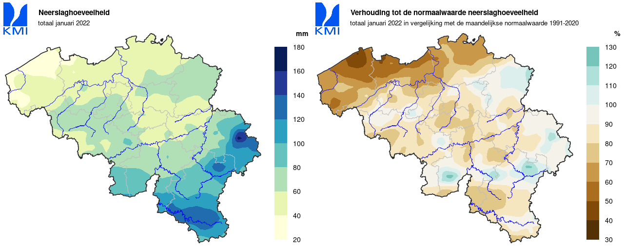 De maandelijkse gemiddelde regionale neerslaghoeveelheden in ons land lagen overal onder de normalen. Ze varieerden van ongeveer 60% van de normale in de Polders tot ongeveer 95% van de normale in het Land van Herve.