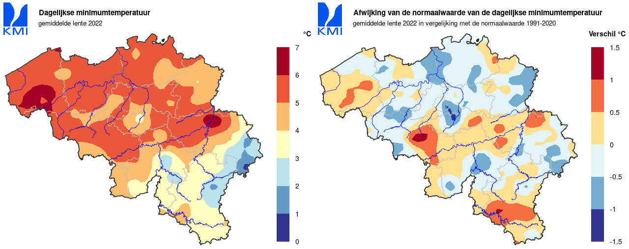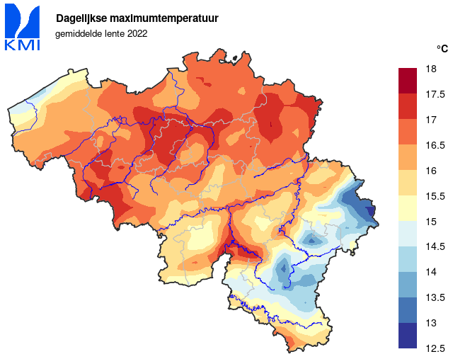 In ons land werd de hoogste temperatuur op 19 mei gemeten (30,8°C in Ophoven (Kinrooi)) en de laagste op 3 april (-9,3°C in Neu-Hattlich (Eupen)).