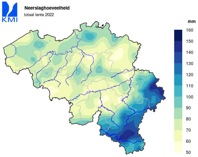 In maart viel er slechts 2,2 mm neerslag in Ukkel – goed voor een nieuw absoluut record – en ook april was droger dan gemiddeld. Het natte einde van mei zorgde ervoor dat deze lente niet in de top-5 van droogste lentes eindigde (zevende plaats, ruim achter het record van 2011 met 70,7 mm neerslag). In Ukkel viel er uiteindelijk 108,8 mm neerslag (normaal: 165,6 mm).