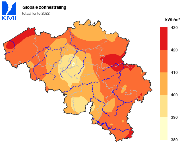 | Globale zonnestraling | kWh/m² | 386.6 | 343.6 | ++ | 436.4 | 2020 | 291 | 1998 |