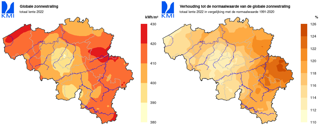 De drie lentemaanden waren in Ukkel allemaal zonniger dan gemiddeld. In maart bereikten we zelfs een nieuw absoluut record. De lente in zijn totaal was dus ook zeer zonnig: 674u 27min (normaal: 495u 19min). Daarmee was dit de derde zonnigste lente voor de huidige referentieperiode, nog ruim achter het record van 2020 (740u 48min) en achter 2011 (707u 16min).