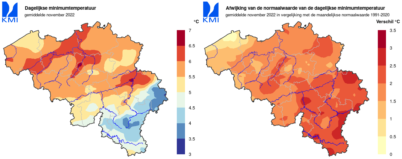 De gemiddelde minimumtemperatuur van november (6,5°C, normaal: 4,6°C) eindigde op de vierde plaats wanneer we naar de huidige referentieperiode kijken. Ook hier blijft het record staan op 1994 (8,1°C).