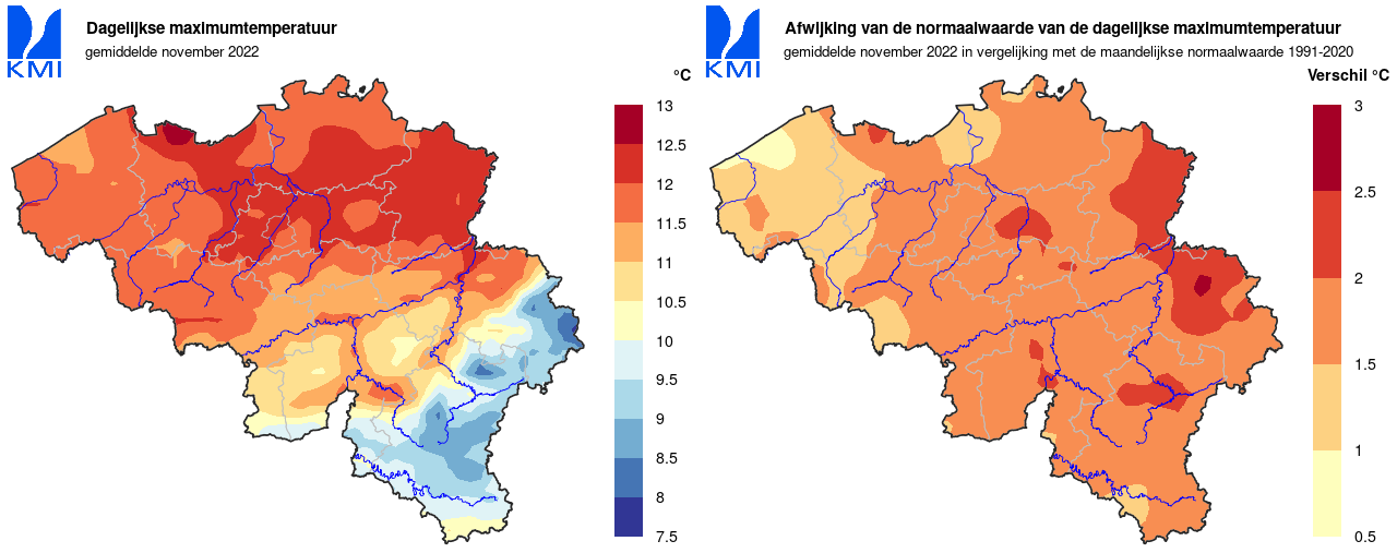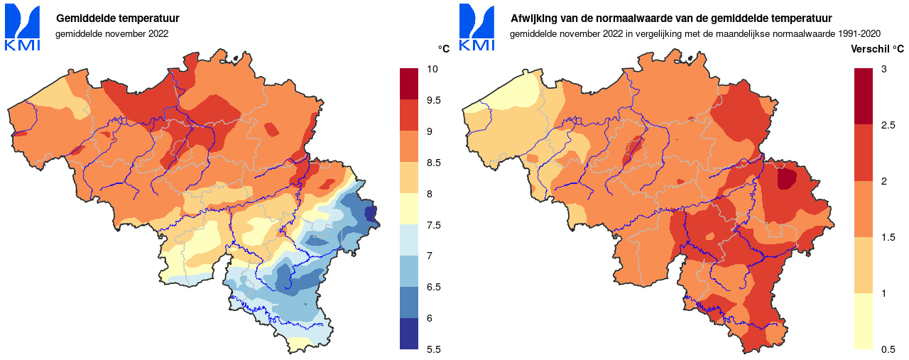 In ons land werd de laagste minimumtemperatuur op 14 november in Steffeshausen (Burg-Reuland) gemeten met -3,5°C. De hoogste temperatuur werd enkele dagen eerder in het noorden van dezelfde provincie gemeten. In Stembert (Verviers) steeg de temperatuur op 12 november nog tot 20,7°C.