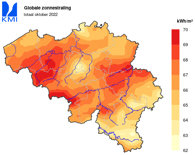 | Globale zonnestraling | kWh/m² | 61.9 | 56.2 | + | 71.3 | 2018 | 33 | 1998 |