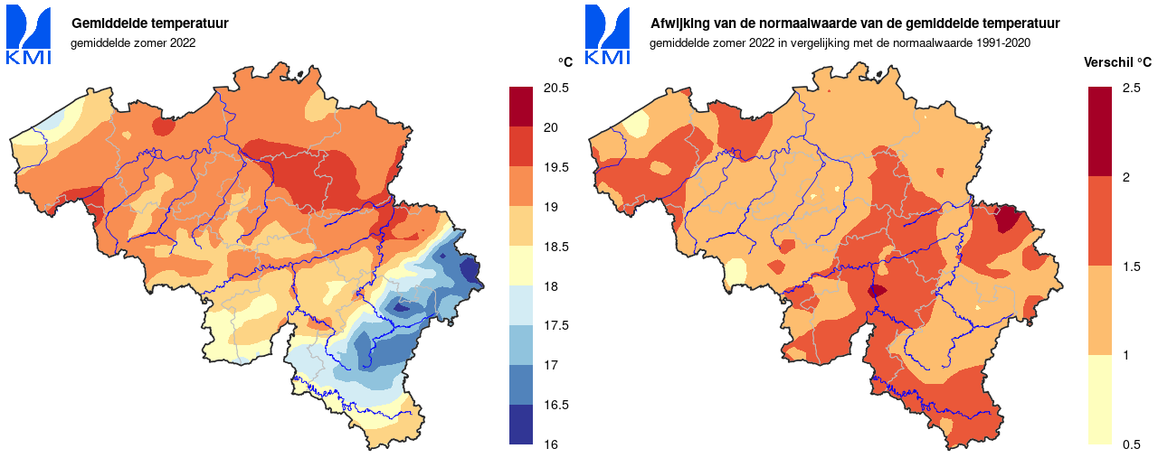 Door de zeer warme maand augustus, was de zomer van 2022 gemiddeld genomen ook heel wat warmer dan normaal. De gemiddelde temperatuur bedroeg in Ukkel 19,6°C (normaal: 17,9°C). Het absolute record blijft staan op 19,9°C (2018).