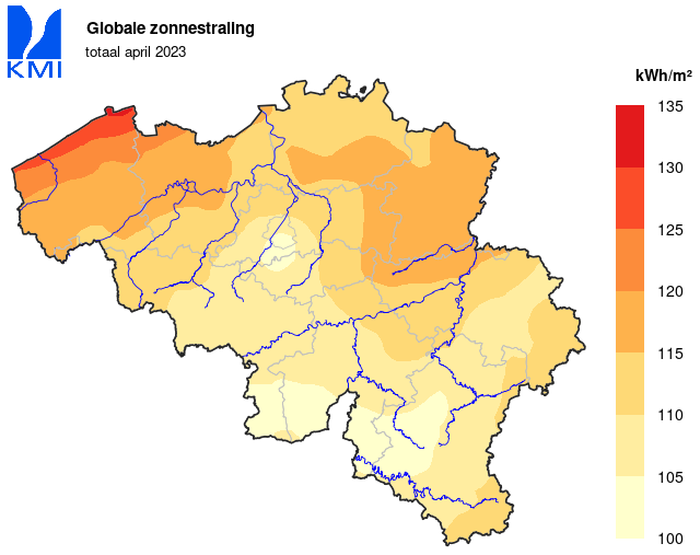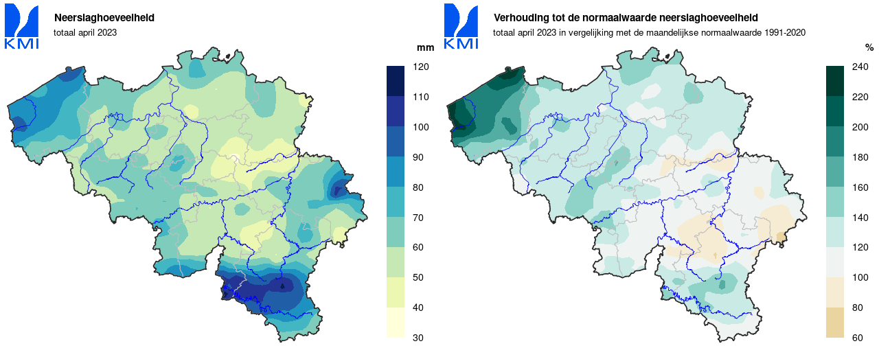 Het grootste dagtotaal werd op 23 april in Lissewege (Brugge) gemeten (31,5 mm).