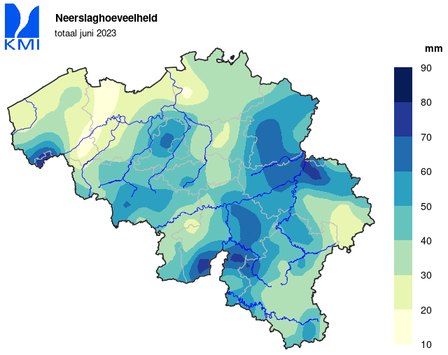 In het klimatologisch meetnet van het KMI werd het grootste dagtotaal op 22 juni in Lauw (Tongeren) gemeten (66,8 mm).