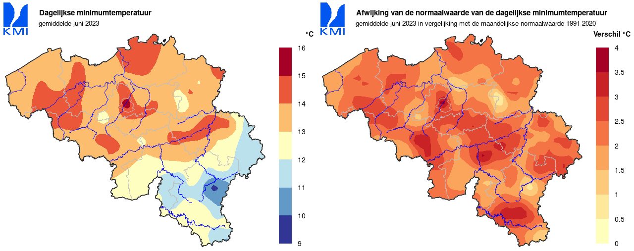 - Gemiddelde minimumtemperatuur: 16,4°C (normaal: 11,9°C). Het vorige absolute record van 15,8°C dateerde nog maar van 2021 (metingen vanaf 1892).