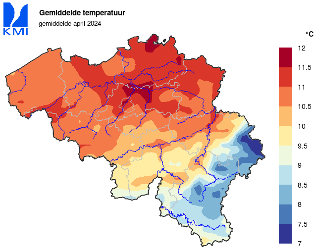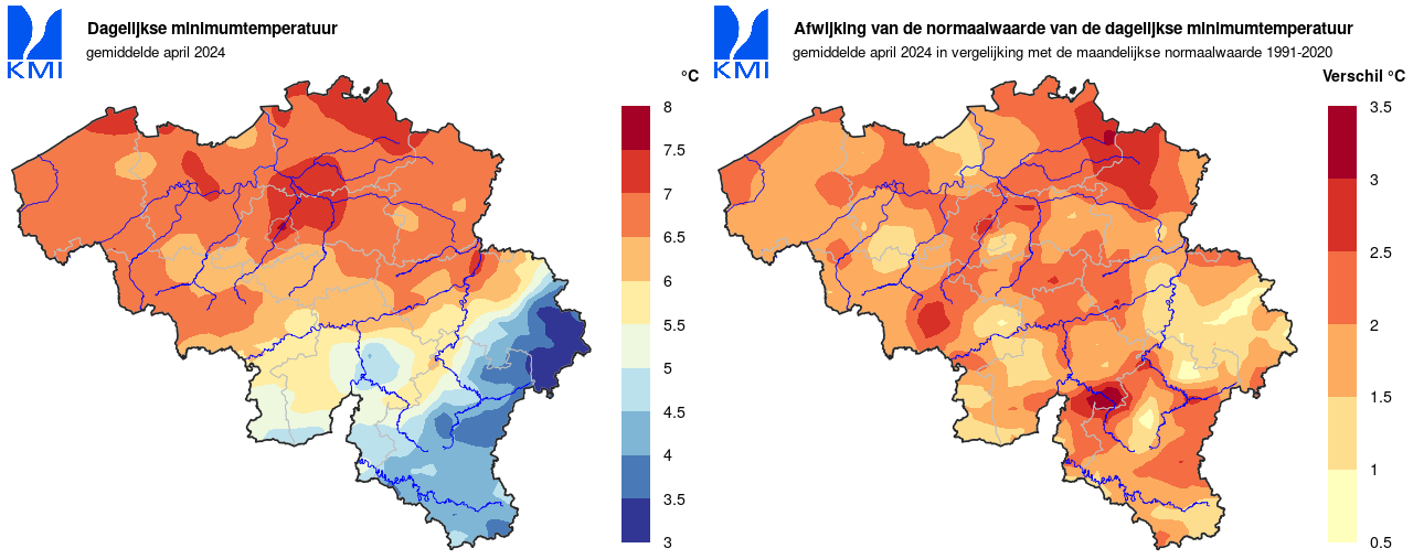 In ons land werd de laagste minimumtemperatuur op 23 april in Elsenborn (Bütgenbach) gemeten met -5,8°C. Deze waarde was lager dan die van maart (-5,1°C) en februari (-3,9°C).