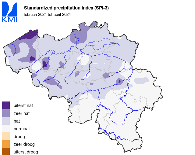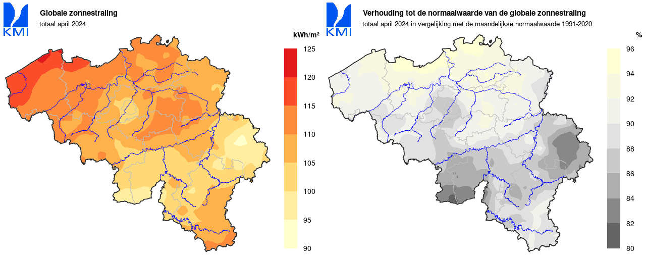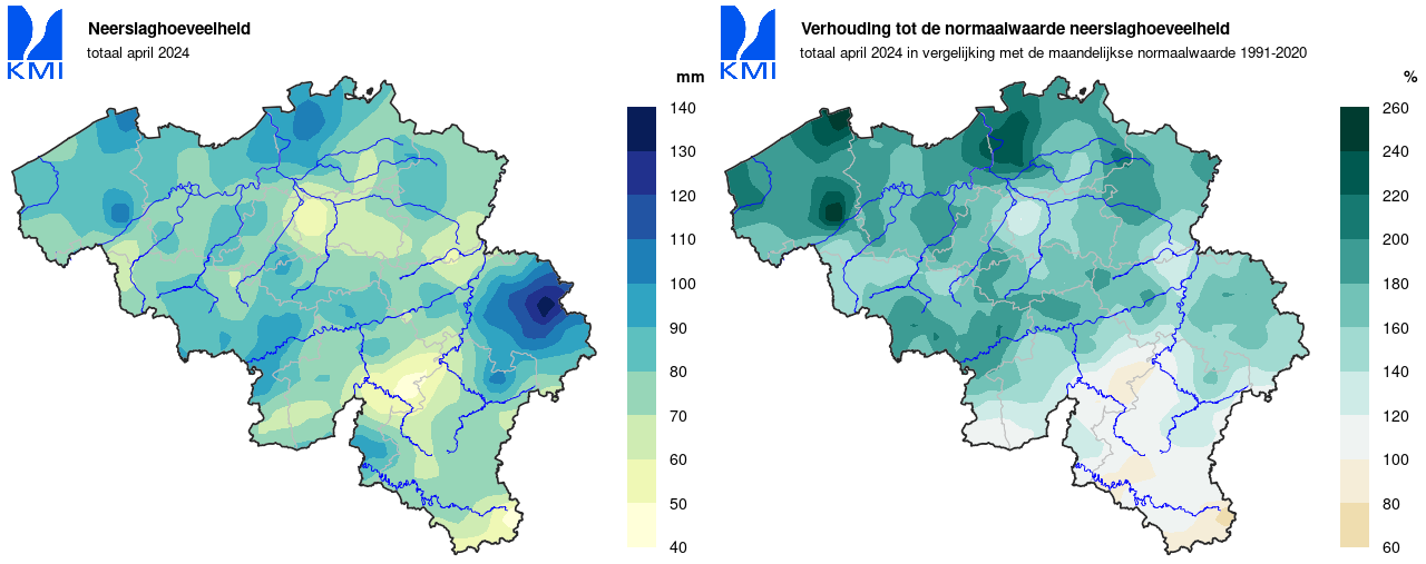 Opmerkelijk: voor Ukkel was april reeds de zevende opeenvolgende maand met meer neerslag dan gemiddeld. De vorige reeks van zeven te natte maanden dateert van december 1994 – juni 1995. Sinds het begin van de waarnemingen in 1833 was dit nog maar de vierde keer dat we zo’n reeks konden registreren (1880, 1905, 1994-1995 en 2023-2024). De langste reeks van opeenvolgende maanden met meer neerslag dan gemiddeld, is deze van 1905 met 8 maanden (maart-oktober 1905).