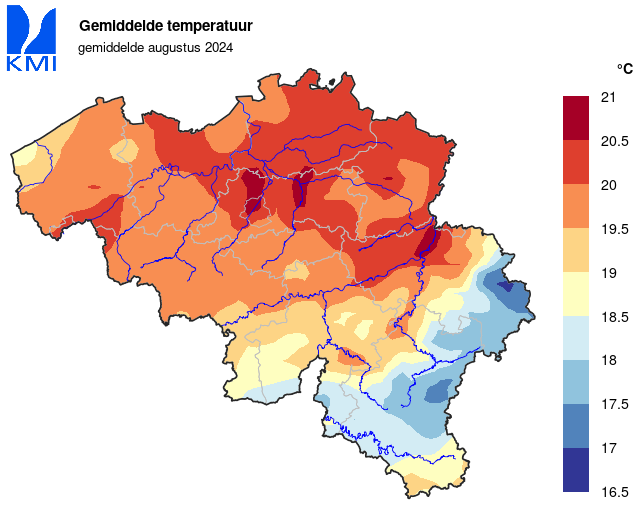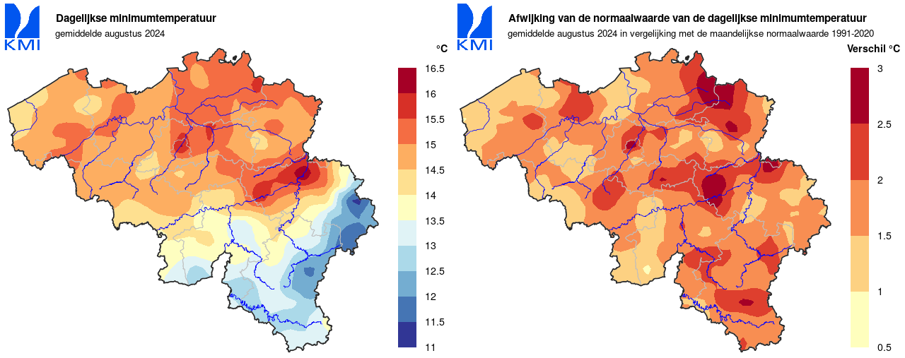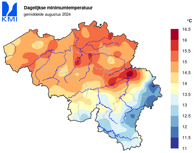 In ons land werd de laagste minimumtemperatuur op 26 augustus in Elsenborn (Bütgenbach) gemeten met 3,6°C. De hoogste maximumtemperatuur werd op 12 augustus in Zele geregistreerd met 36,0°C.